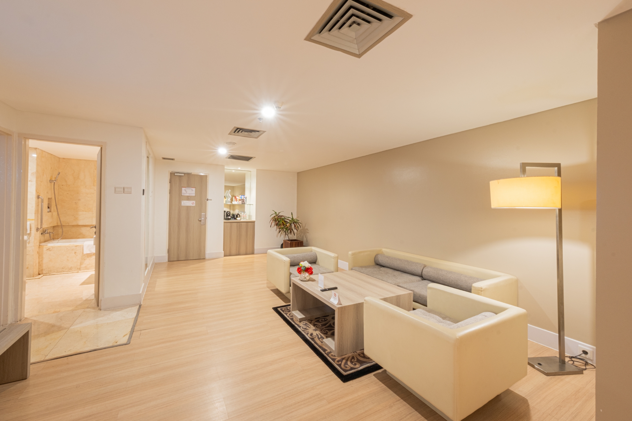 The Executive Suite is the largest and most luxurious room with 80 sqm of space and stunning views of the city and pool. It has a spacious living room, a comfortable sofa, and premium amenities...